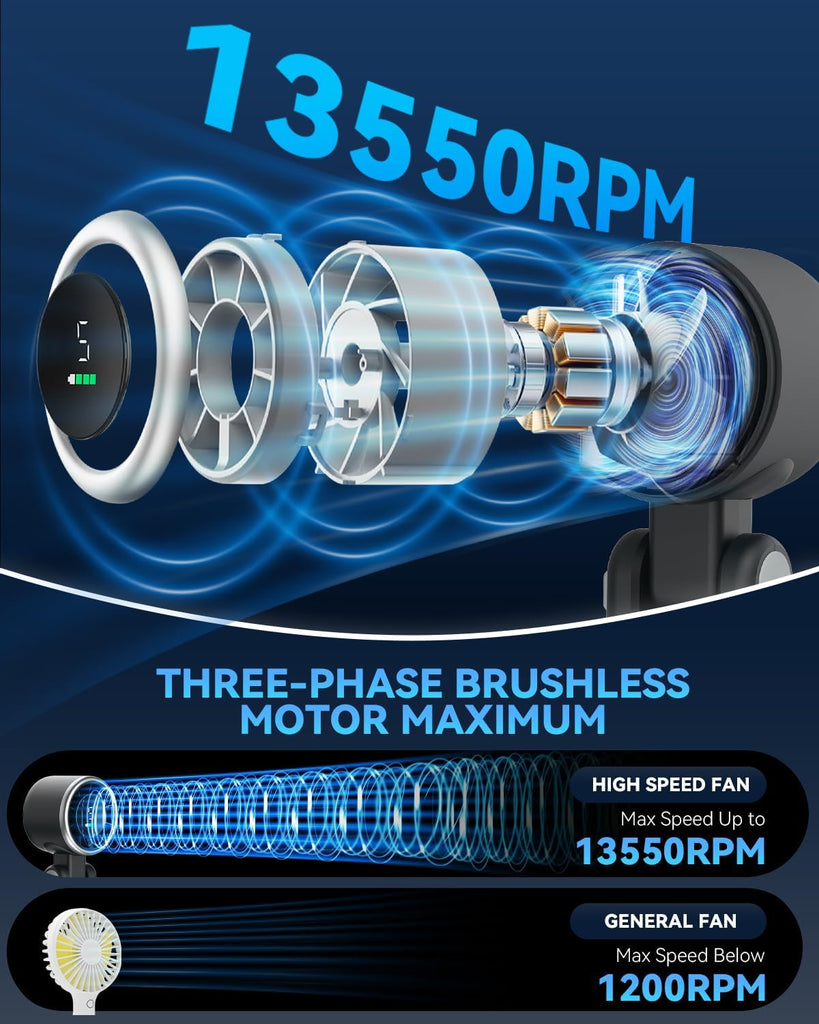 𝟏𝟑𝟓𝟓𝟎 𝐑𝐏𝐌 𝐔𝐥𝐭𝐢𝐦𝐚𝐭𝐞 𝐂𝐨𝐨𝐥𝐢𝐧𝐠 𝐄𝐱𝐩𝐞𝐫𝐢𝐞𝐧𝐜𝐞 - This handheld turbo fan adopts an advanced 6-blade design and is equipped with a high-speed three-phase brushless motor, with a maximum wind speed of up to 10m/s. Maximum speed is 13,550 rpm, which is 3 times that of ordinary handheld fans. Perfect for relieving the heat during hot journeys.